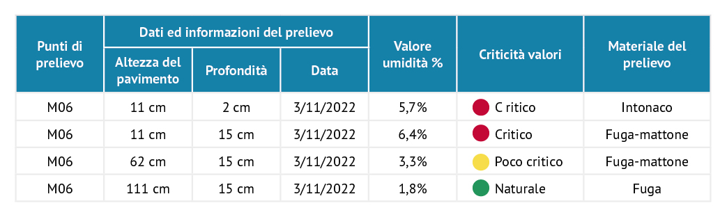 I valori regolari e poco critici nella maggioranza delle murature dimostravano che si trattava principalmente di umidità residua e igroscopica causata dai sali da precedenti fenomeni imbibitivi.