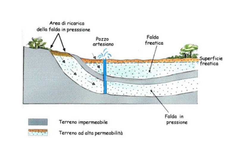 * falde acquifere freatiche continue/discontinue e falde ipogee;